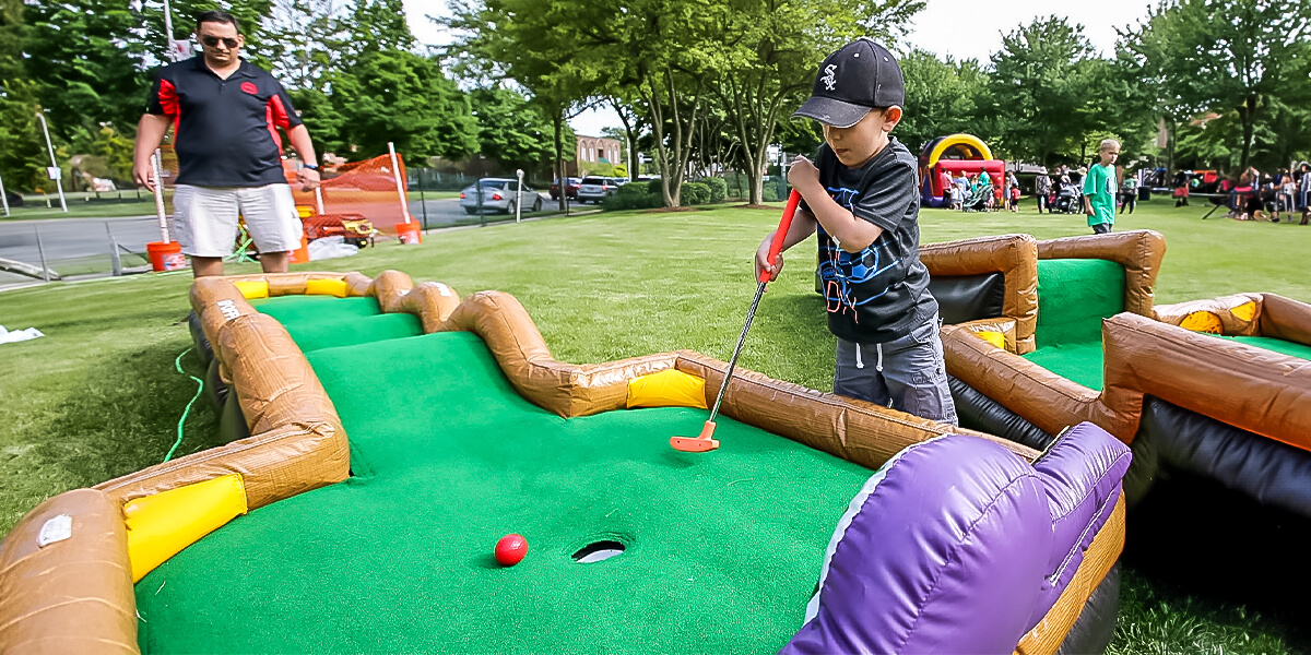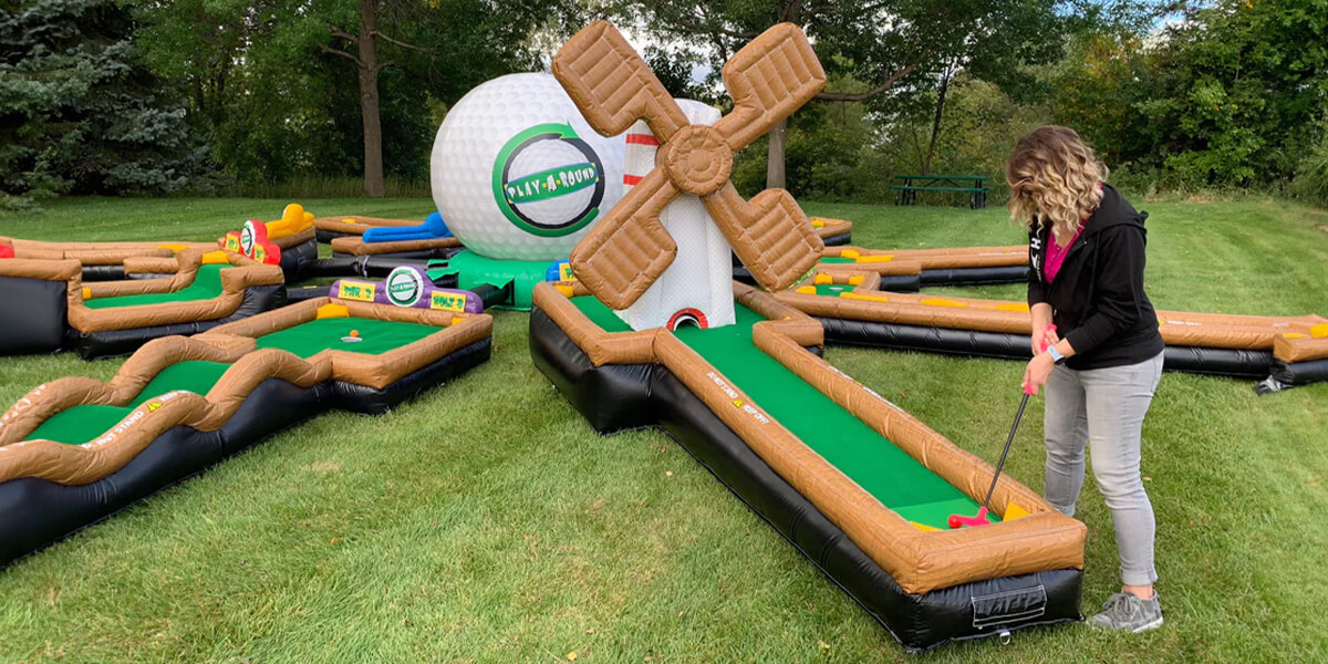 This state-of-the-art inflatable mini golf setup boasts a central hub that seamlessly integrates our exclusive Loop-de-Loop™, Spiral, and motorized windmill holes.
